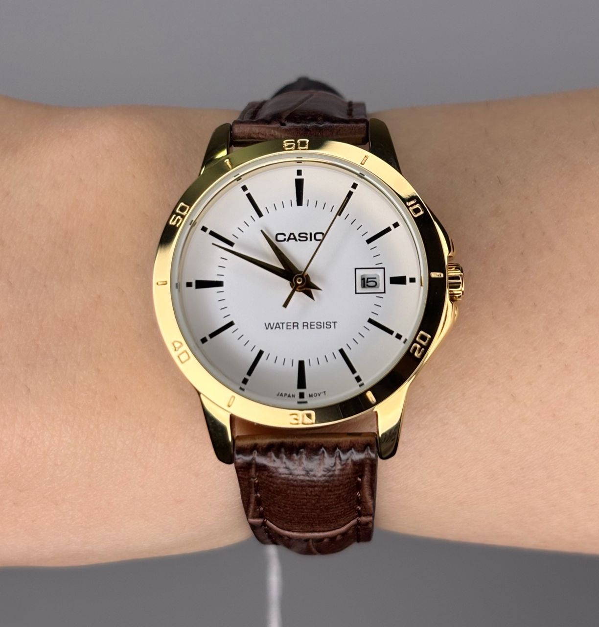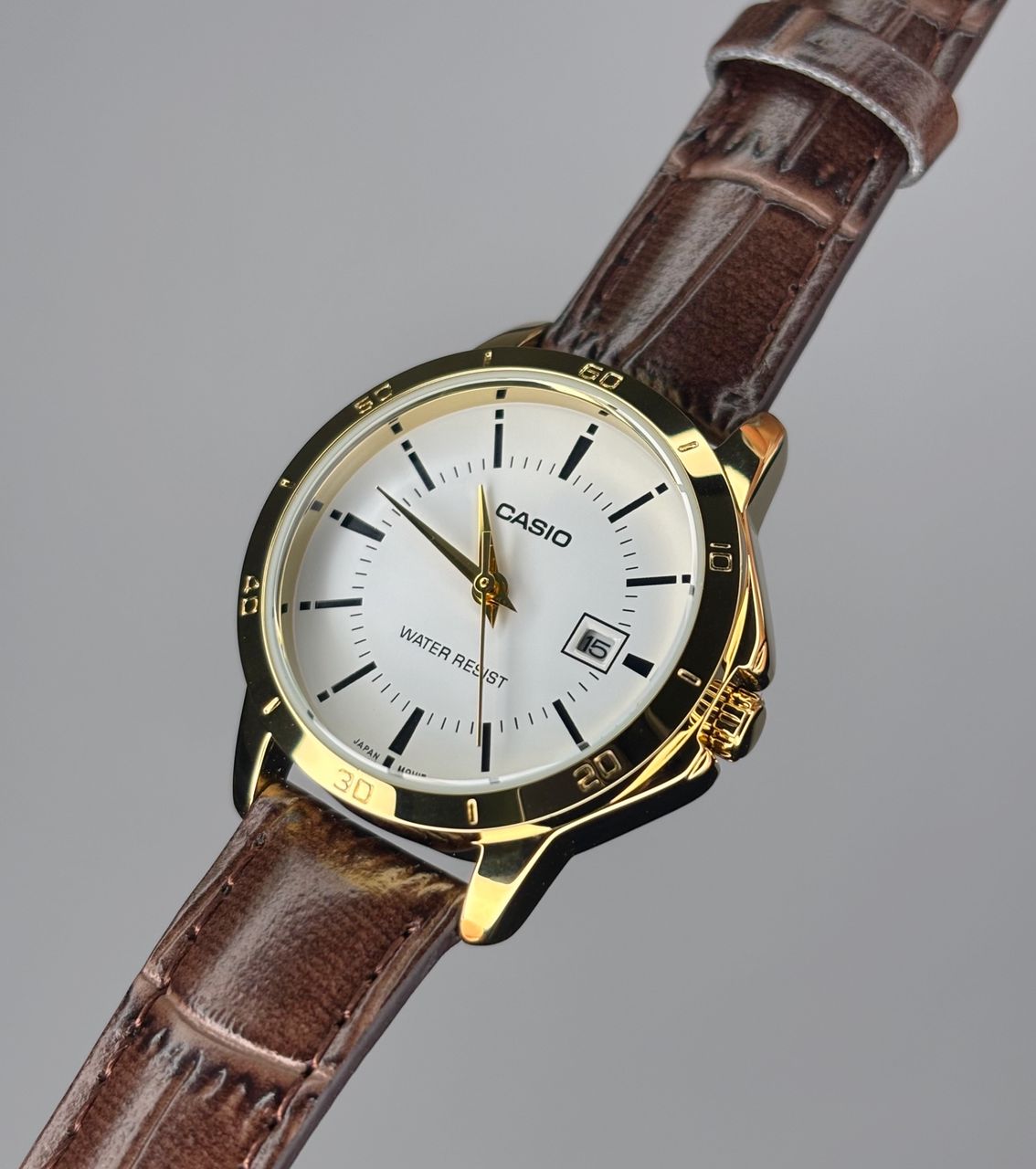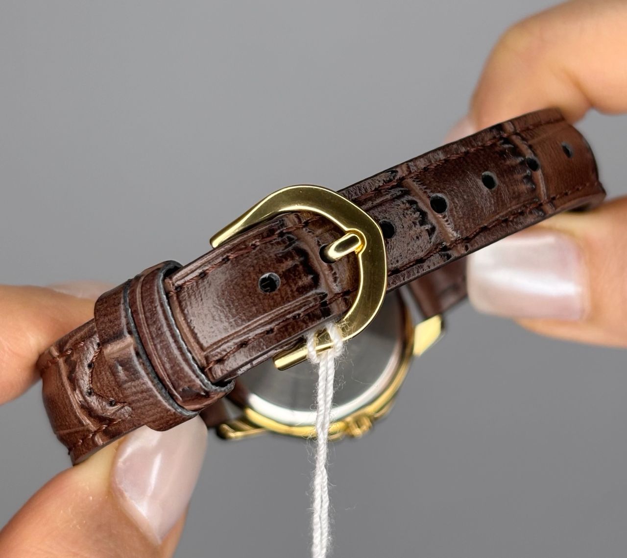 این ساعت مچی با صفحه سفید ساده،قاب طلایی ظریفو بند چرم قهوه ای ، ترکیبی متعادل از وقار کلاسیک و زیبایی مدرن را ارئه می دهد.طراحی مینیمال صفحه ، خوانایی بالا و جلوه ای تمیز ایجاد کرده که به راحتی با استایل رسمی،اداری و روزمره هماهنگ میشود.بند چرمی قهوه ای علاوه بر ظاهر گرم و شیک، حس راحتی مطلوبی در استفاده طولانی مدت فراهم میکند . کیفیت ساخت مناسب و دقت عملکرد ، این ساعت را به گزینه ای قابل اعتماد برای استفاده روزانه تبدیل کرده است.تجربه استفاده از آن،حس نظم،سلیقه و انتخابی آگاهانه را منتقل میکند.ساعتی که قرار نیست جلب توجه اغراق آمیز کند اما همیشه دیده می شود.